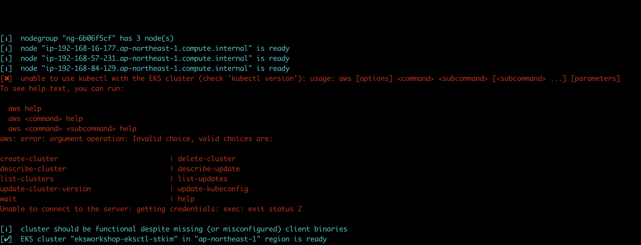 eksctl create cluster --version=1.13 --name=eksworkshop-eksctl-stkim881116 --nodes=3 --node-ami=auto --region=ap-northeast-2
