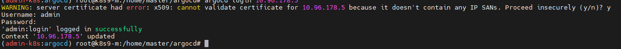 WARNING: server certificate had error: x509: cannot validate certificate for 10.96.178.5 because it doesn't contain any IP SANs. Proceed insecurely (y/n)? y