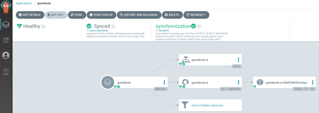 이 명령은 저장소에서 매니페스트를 검색하고 매니페스트를 수행합니다 kubectl apply. 이제 방명록 앱이 실행 중이며 이제 해당 리소스 구성 요소, 로그, 이벤트 및 평가된 상태를 볼 수 있습니다.