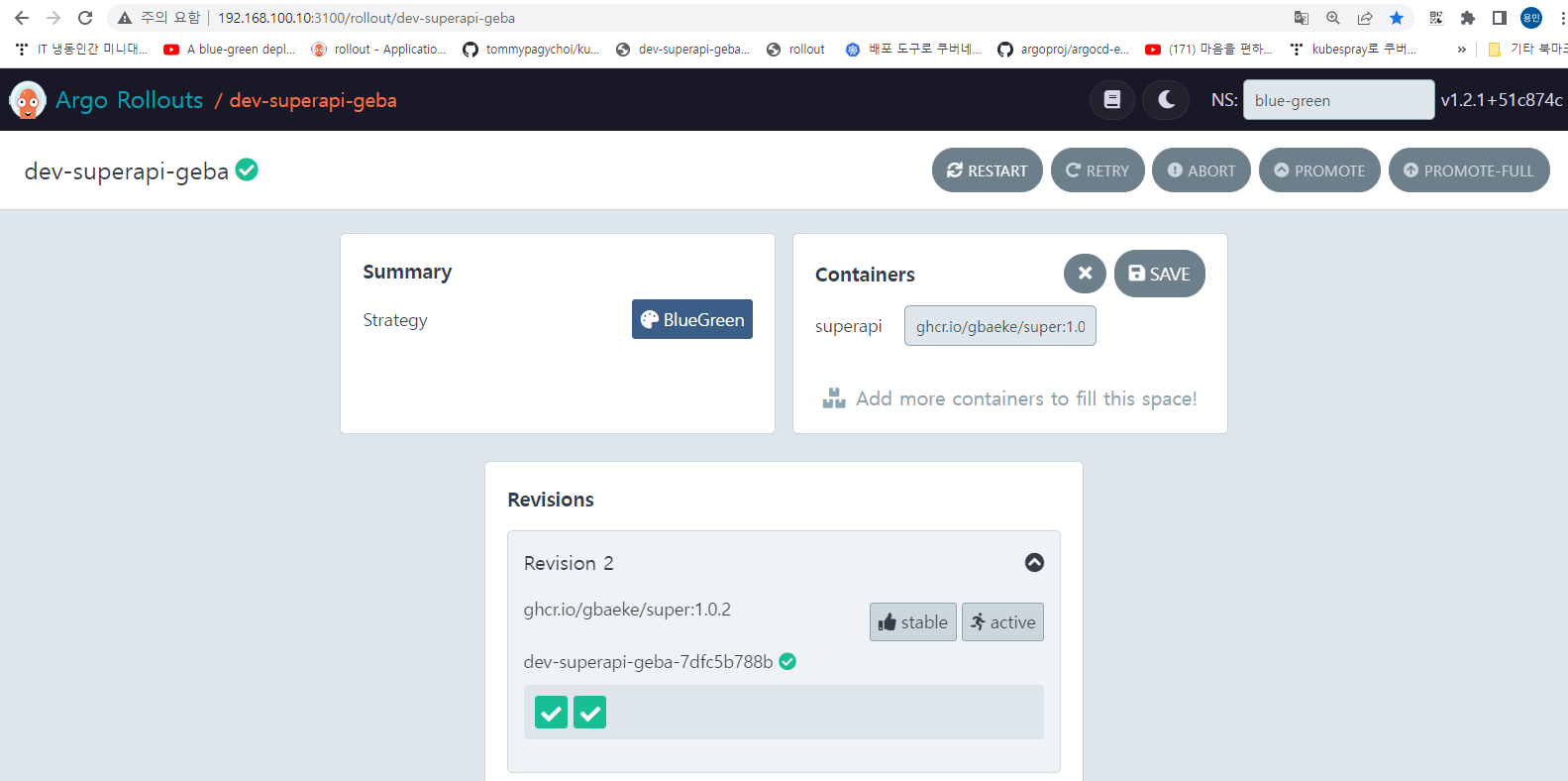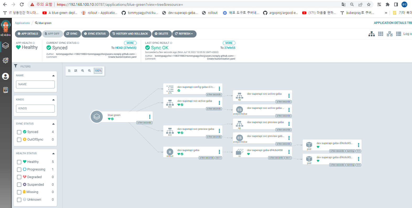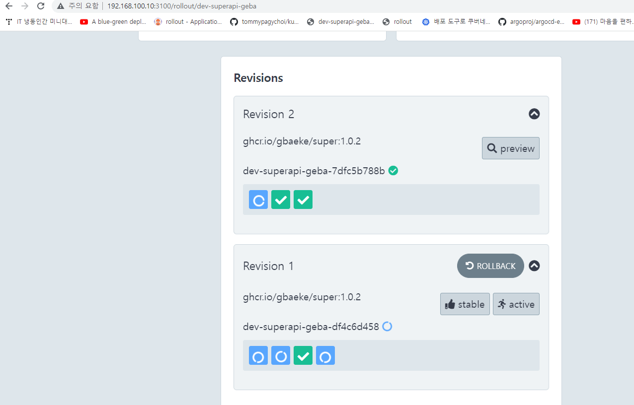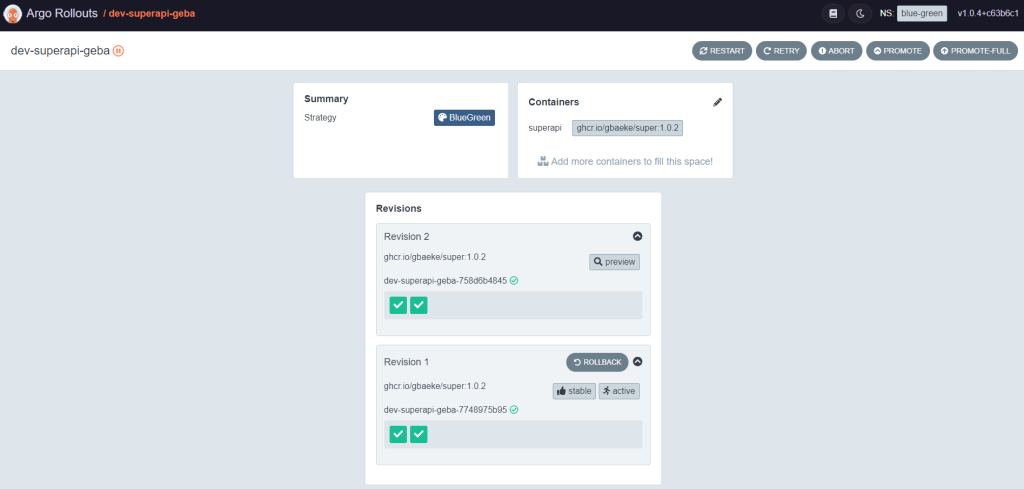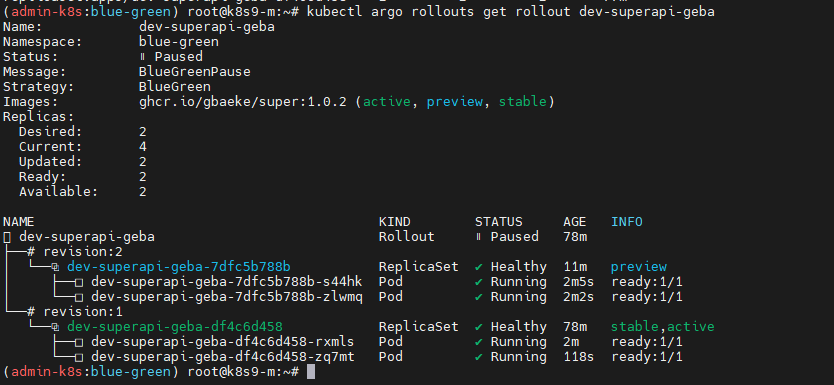 현재 출시가 일시 중지된 상태입니다. Argo Rollouts UI는 이것을 보여주지만 다음을 실행하여 CLI로 볼 수도 있습니다 kubectl argo rollouts get rollout dev-superapi-geba.