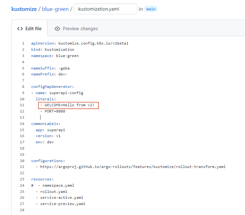 이제 애플리케이션의 새 버전인 v2로 업그레이드합니다. 이를 시뮬레이션하기 위해 kustomization.yaml 의 ConfigMapGenerator 에서 WELCOME 메시지를 수정하면 됩니다.